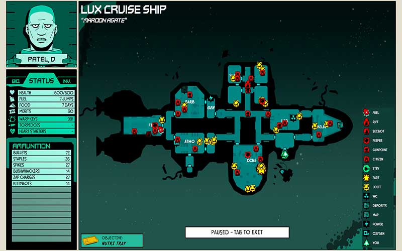 Pianifica la tua missione, impara la disposizione della nave e guida la tua banda di prigionieri attraverso le sfide e i nemici che si frappongono tra loro e la sopravvivenza. Cerca disperatamente i rifornimenti, cerca il cibo, brandisci armi improvvisate e scegli quando combattere e scappare