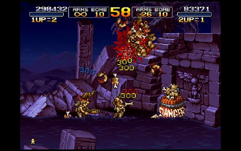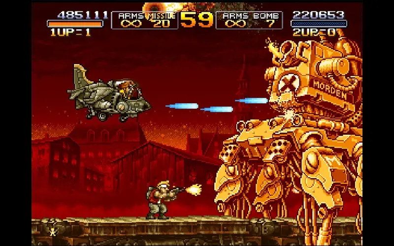 METAL SLUG 2 è uno sparatutto a scorrimento laterale in 2D sviluppato da SNK CORPORATION e Dotemu, il secondo gioco della serie Metal Slug. Sono passati due anni dagli eventi del primo Metal Slug e dalla sconfitta del generale Morden. I resti della sua fazione, un tempo ritenuti insignificanti, ora agiscono all’unisono. Potrebbe essere opera di Morden? È ancora vivo?