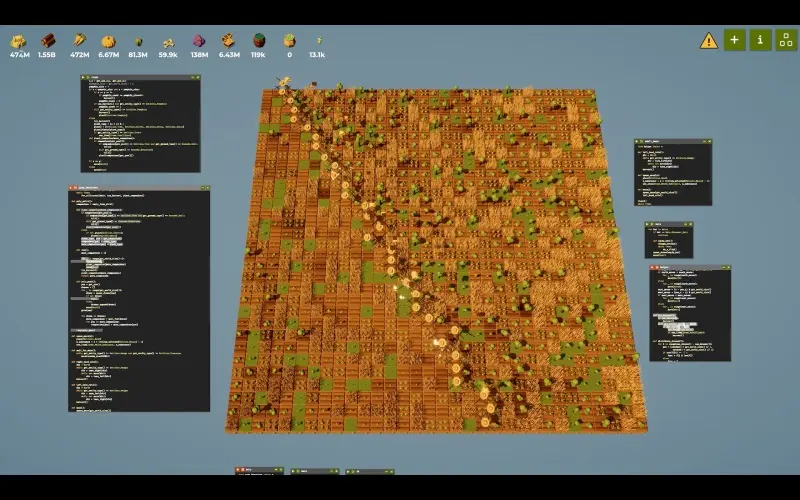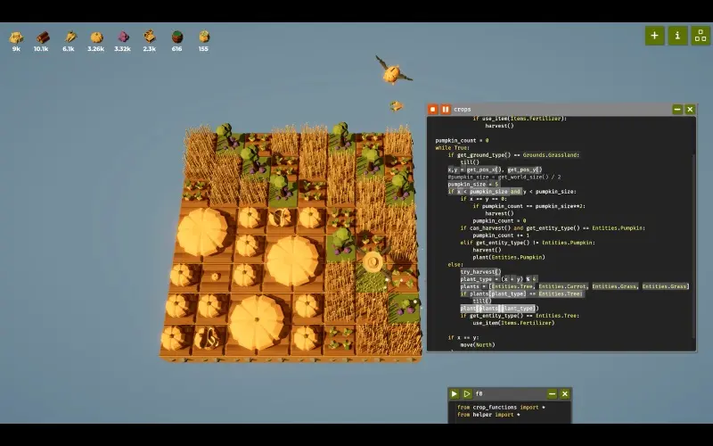 • Impara le basi della programmazione automatizzando una fattoria con un linguaggio semplice, simile a Python, per sbloccare nuove tecnologie.