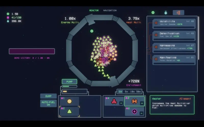 Alimenta un reattore in crescita e metti alla prova le tue abilità mentre combini elementi per generare energia. Ogni nuova scoperta amplia il tuo raggio d’azione in una strana galassia, rivelando altri elementi da combinare e consumare. Ogni decisione influenza la potenza del tuo reattore!