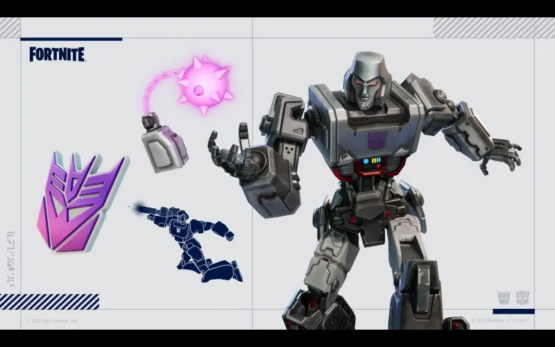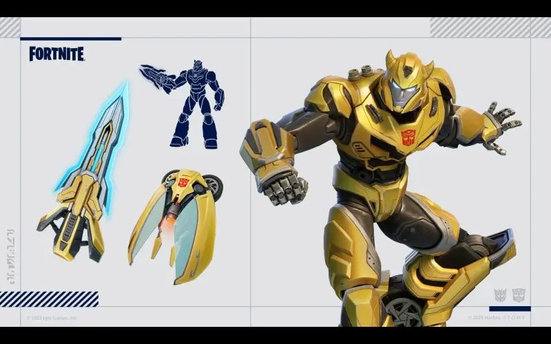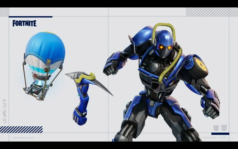 Il pacchetto Fortnite Transformers contiene tre oggetti cosmetici della serie Transformers. Include 3 costumi, 3 accessori per la schiena, 3 picconi, 2 emote e 1.000 V-buck!