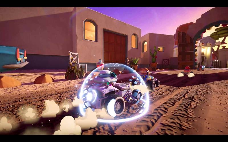 • Raccogli una serie di oggetti strategici sulla strada, usa il dardo teleguidato per colpire il leader, la biglia per colpire l’auto davanti a te, lancia un disco subdolo che rallenta chiunque ci passi sopra, difenditi con lo scudo o supera la concorrenza con un turbo boost.