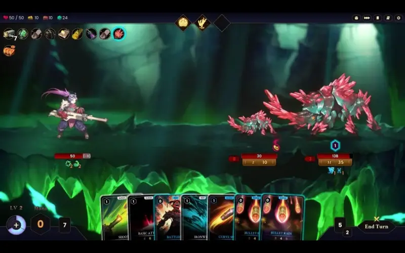 • Invece di infliggersi danni diretti a vicenda, il combattimento si svolge in duelli di tiro alla fune, dove l’attacco diventa la migliore forma di difesa, ma con una quantità limitata di risorse, il mana non si rigenera automaticamente. Ispirato al sistema Land di Magic: The Gathering, le combo che puoi eseguire sono determinate dalla quantità di mana che riesci a gestire.