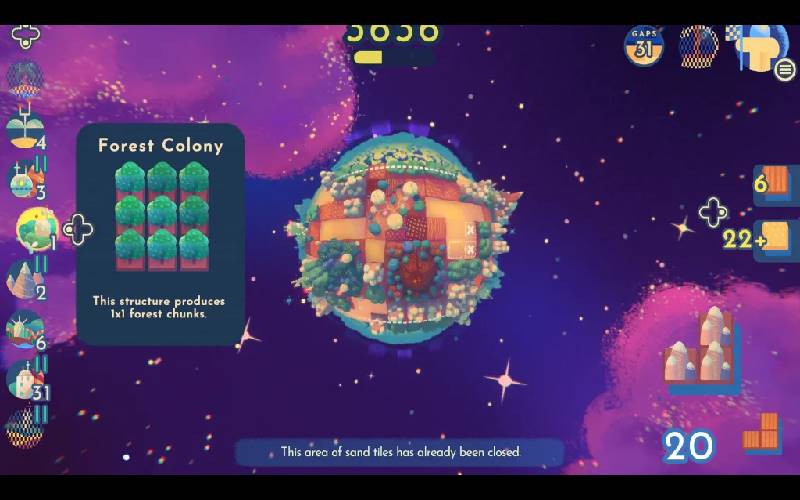 Dai vita a pianeti alieni posizionando strategicamente tessere e costruendo diversi biomi. Man mano che avanzi, gestisci risorse limitate e completa missioni per far crescere i tuoi habitat, creando splendidi mondi equilibrati nel processo.