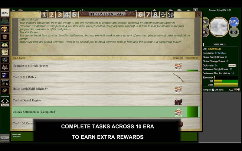 Settlements è un gioco di strategia ambientato in un mondo post-apocalittico in cui ricostruirai la civiltà. Gestisci le risorse, guida la tua società attraverso le ere e affronta sfide come la diplomazia e le minacce dei mostri per garantire sopravvivenza e crescita.