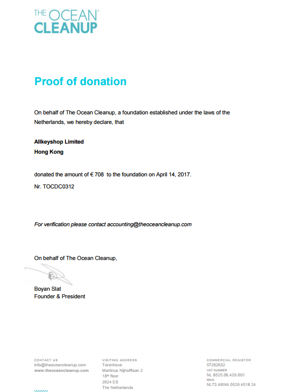 Siamo anche felici di annunciare che The Ocean Cleanup ci ha dato un Prova ufficiale della donazione firmata da Boyan Slat, CEO e fondatore di The Ocean Cleanup.